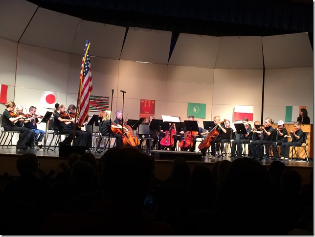 Concert time! This is the 5th grade orchestra…Becca is just left of the flagpole. We could hardly see her because they left that flag up the whole concert!